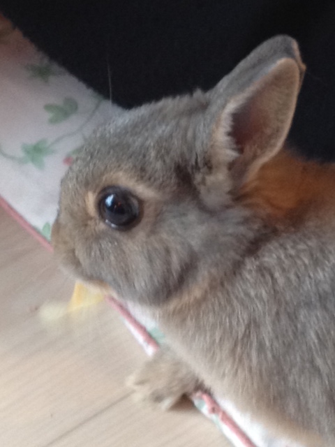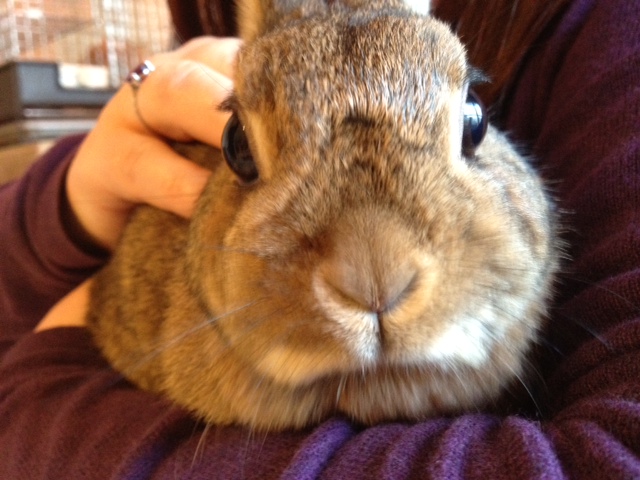 looked just like all the rabbits you can see wild in the UK (I always look out for them when I take a train) but they bounded about and for the most part were happy to be held for a short time. Here is Donguri relaxing under a table