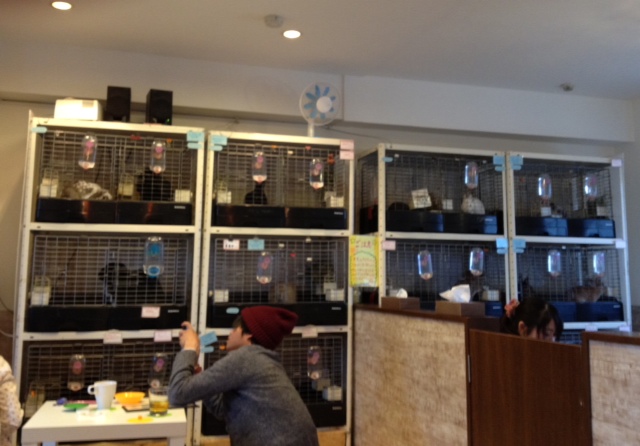 There were two small rabbits hopping about in the cafe, and about twenty in cages at the end of the room.
