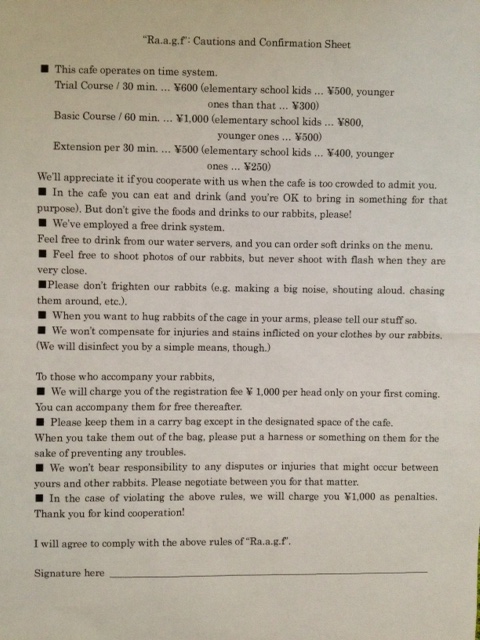 choose a drink and then enjoy being with the rabbits. My favourite regulation is the one which states, ‘We won’t compensate you for injuries and stains inflicted on your clothes by our rabbits. (We will disinfect you by a simple means, though.)’ You have been warned!