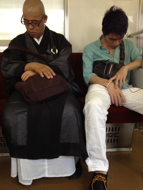 I have twice seen people at the station or on the train wearing yukata, lightweight summer kimono made of cotton. A few days ago I saw this teenage girl waiting for a train at my local station